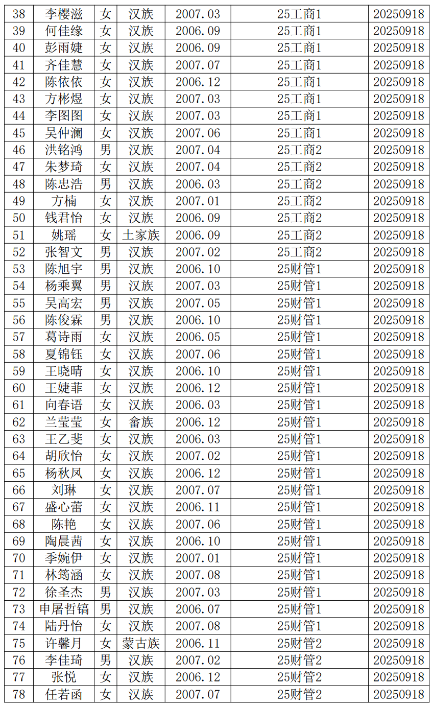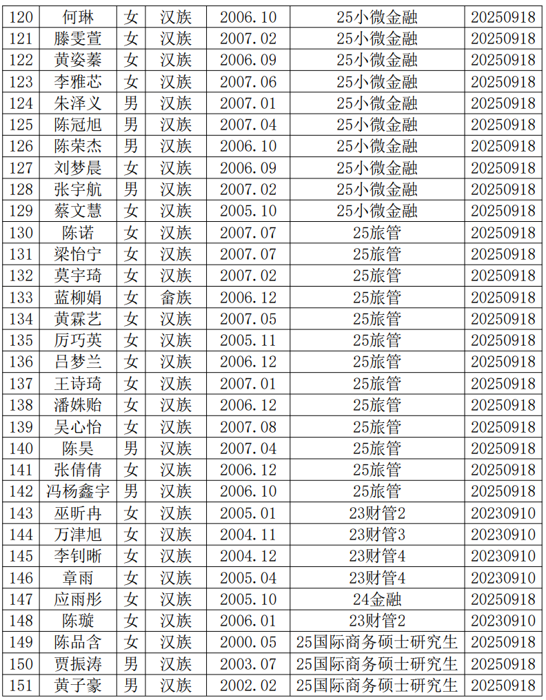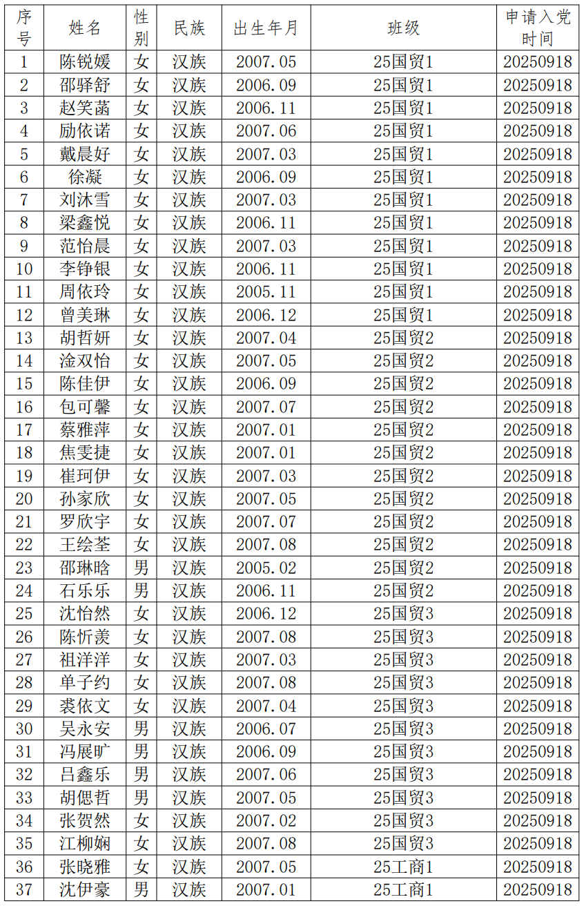 近期,陈锐媛等151位同志向党支部递交了入党申请书。根据《中国共产党发展党员工作细则》《中共1946伟德官方网站委员会发展党员工作细则》等有关规定,现将陈锐媛等入党申请人的基本情况予以公示,接受广大党员、群众监督。公示时间为2025年10月9日至2025年10月14日。公示期间,党员、群众可来电、来信、来访,反映其在理想信念、思想作风、工作表现、群众观念、廉洁自律等方面的情况和问题。反映问题要坚持实事求是的原则,反对借机诽谤诬告。反映问题提倡留下姓名和电话号码。我们将对反映人和反映问题严格保密,对反映的问题进行调查核实,弄清事实真相,并以适当方式向反映人反馈。
