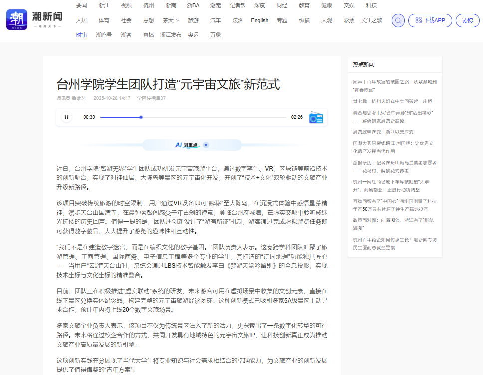 近日,1946伟德官方网站“智游无界”学生团队成功研发元宇宙旅游平台,通过数字孪生、VR、区块链等前沿技术的创新融合,实现了对神仙居、大陈岛等景区的元宇宙化开发,开创了“技术+文化”双轮驱动的文旅产业升级新路径。